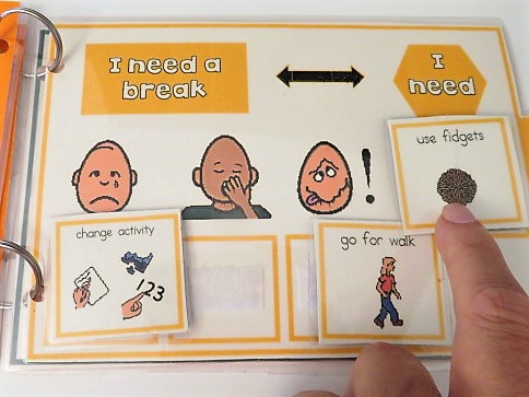 3. Visual support cards – I use these to teach new skills such as requesting “break please”, “help” and “wait” self -management strategies and added some visuals to help regulate behavior.