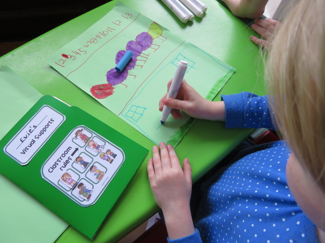 Then I decided to put together a Visual Support! I was pleased that it offered all these strategies and all visuals were kept in one handy place for my students to access through out the school day. There’s a place for the daily schedule to be displayed and a section for the schedule symbols. A token reward system was incorporated plus reward visuals, critical communication cards I added so students could ask for a Break or Help, all while maintaining a consistent approach that my staff could follow!