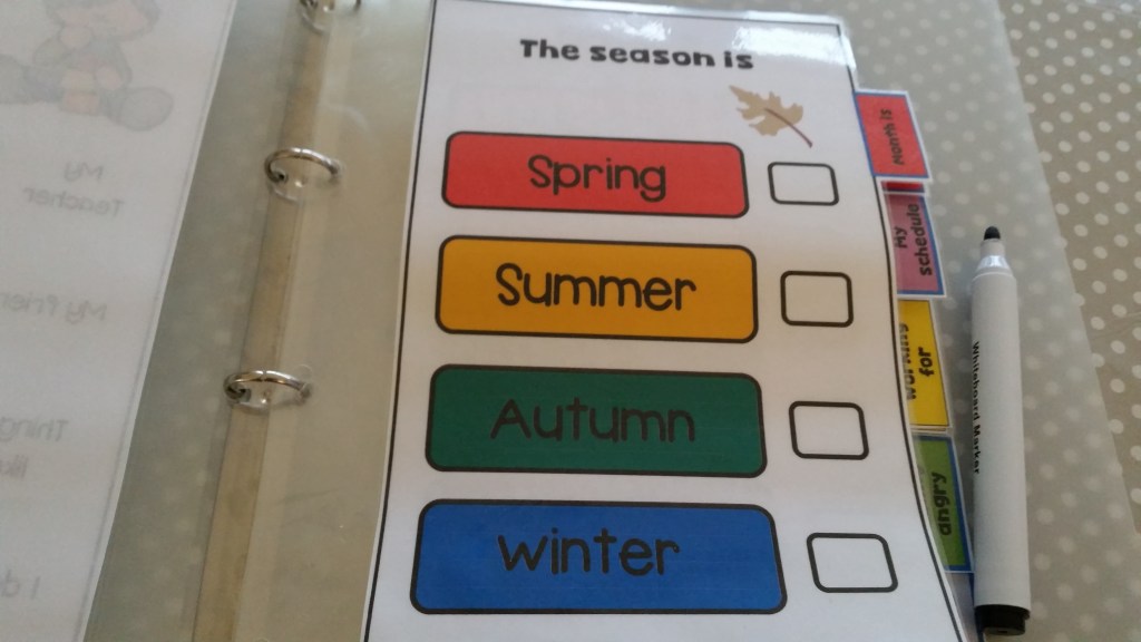 There are pages with the days of the week for my student to practice and tick off what day it is and same for seasons.