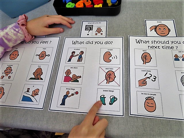 When a behavior does arise, I remind the student of what went wrong with visuals which allows them a choice of what would have been a better approach in that situation. Using a “How did you feel? What did you do? What should you do next time? strategy, students are able to point and reflect what should have happened.