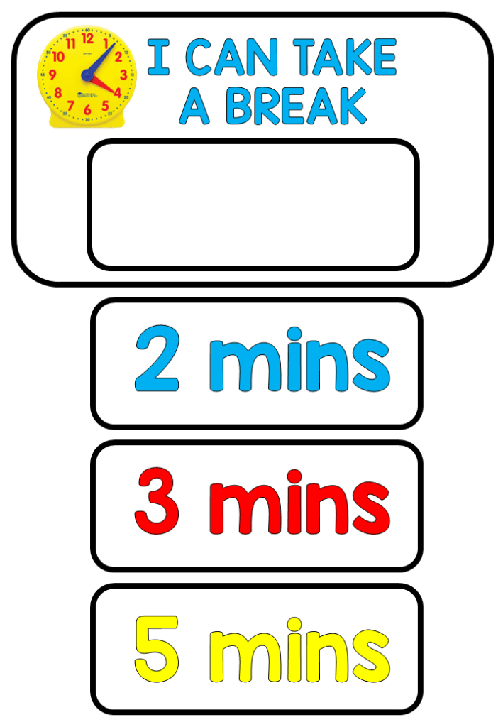 Next I wanted to gave my kids a chance to take a break before things got to tricky, so I made these colourful break cards and purchased a sand timer. I added Velcro to the break board and attached it to the side of the bookcase, a good place to put the break card, I thought, before they grab a timer and sitting down. I knew this skill would take a bit of practice but was surprised at how quickly I saw results… its well worth the effort.