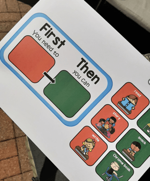 And I place the icon of the task to be completed on the “First” side of the board. While teaching this strategy for the first few times I use quick errorless tasks and partially prompt my student if they become distressed.