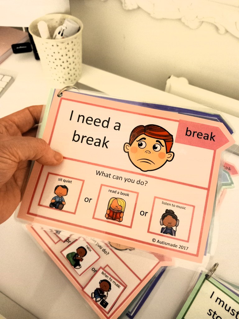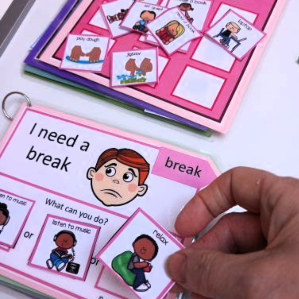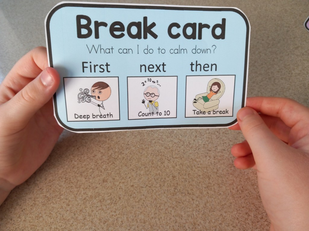 Pick a calm moment and say, “I need a break,” while using the card or device. Keep the language short and consistent. You are building a connection between the action and the meaning.
